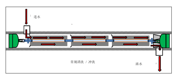 常見的反滲透的沖洗設(shè)計一般是從壓力容器進水端流入,經(jīng)過膜元件后從壓力容器濃水端流出,這個流向與反滲透系統(tǒng)正常運行時是一樣的。反滲透的反向沖洗指的是由濃水端向進水端方向進行沖洗的過程, 反向沖洗有助于去除反滲透系統(tǒng)的前端污染物,采用此方法進行沖洗反滲透膜元件受到的污染更?。划斢蓄w粒物(細砂、活性炭)時,必須采用此方法,以免反滲透膜表面被劃傷。需要注意的是任何時候嚴禁由產(chǎn)水端向進水端進行沖洗,這會造成反滲透膜元件背壓,使反滲透膜元件受到不可逆轉(zhuǎn)的損害。